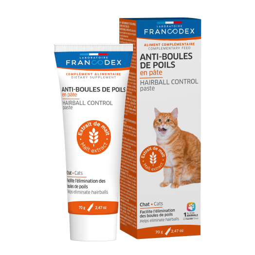 La PÂTE ANTI-BOULES DE POILS FRANCODEX, grâce à sa teneur en malt, aide à prévenir la formation des boules de poils au niveau du tube digestif des chats, et favorise leur élimination.