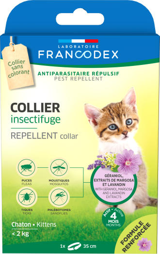 Sans PVC, sans phtalates et formulé à base de géraniol, d’extraits de margosa et de lavandin aux propriétés répulsives, le COLLIER INSECTIFUGE FRANCODEX protège votre chaton pendant 4 mois de toute infestation par des parasites. Le collier dispose d’un système de sécurité qui permet la rupture du collier en cas d’étranglement accidentel. Le packaging est en carton 100% recyclé afin de contribuer à réduire notre empreinte carbone.
