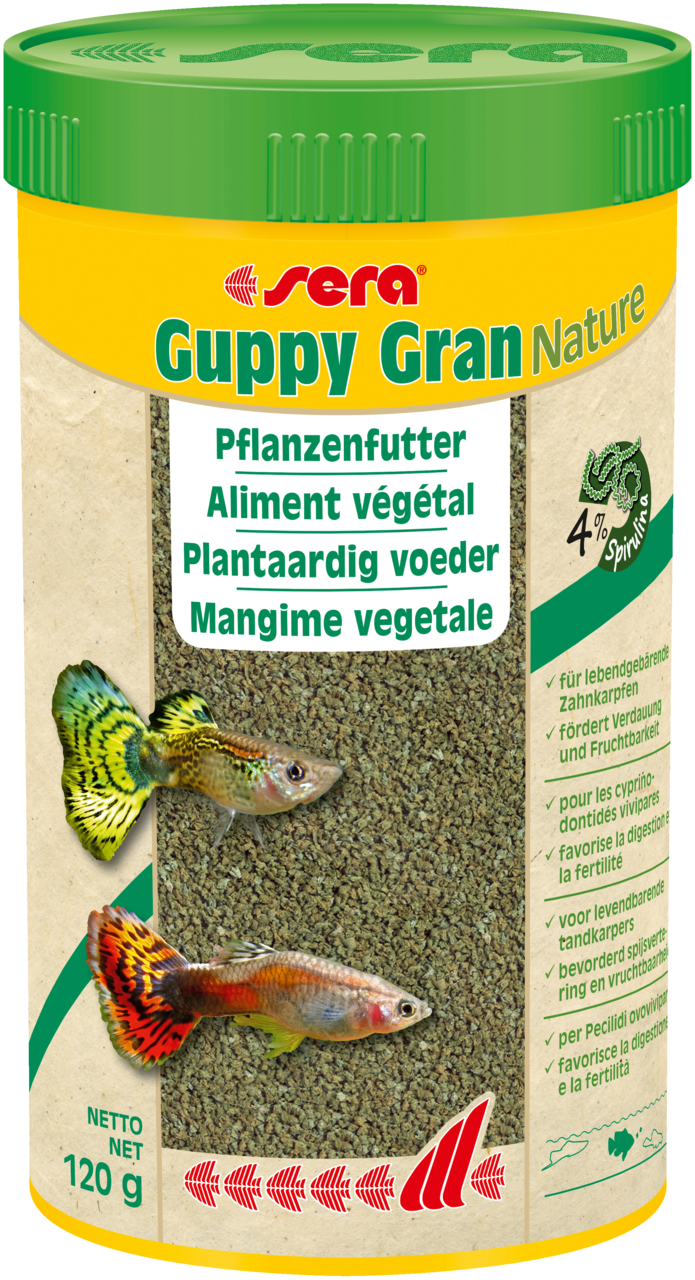 sera Guppy Gran Nature est l’aliment végétal, à base de granulés moelleux fabriqué selon un procédé spécial, sans colorants ni conservateurs, pour tous les poissons principalement herbivores se nourrissant dans les couches moyennes de l’eau, comme p.ex. les guppys.