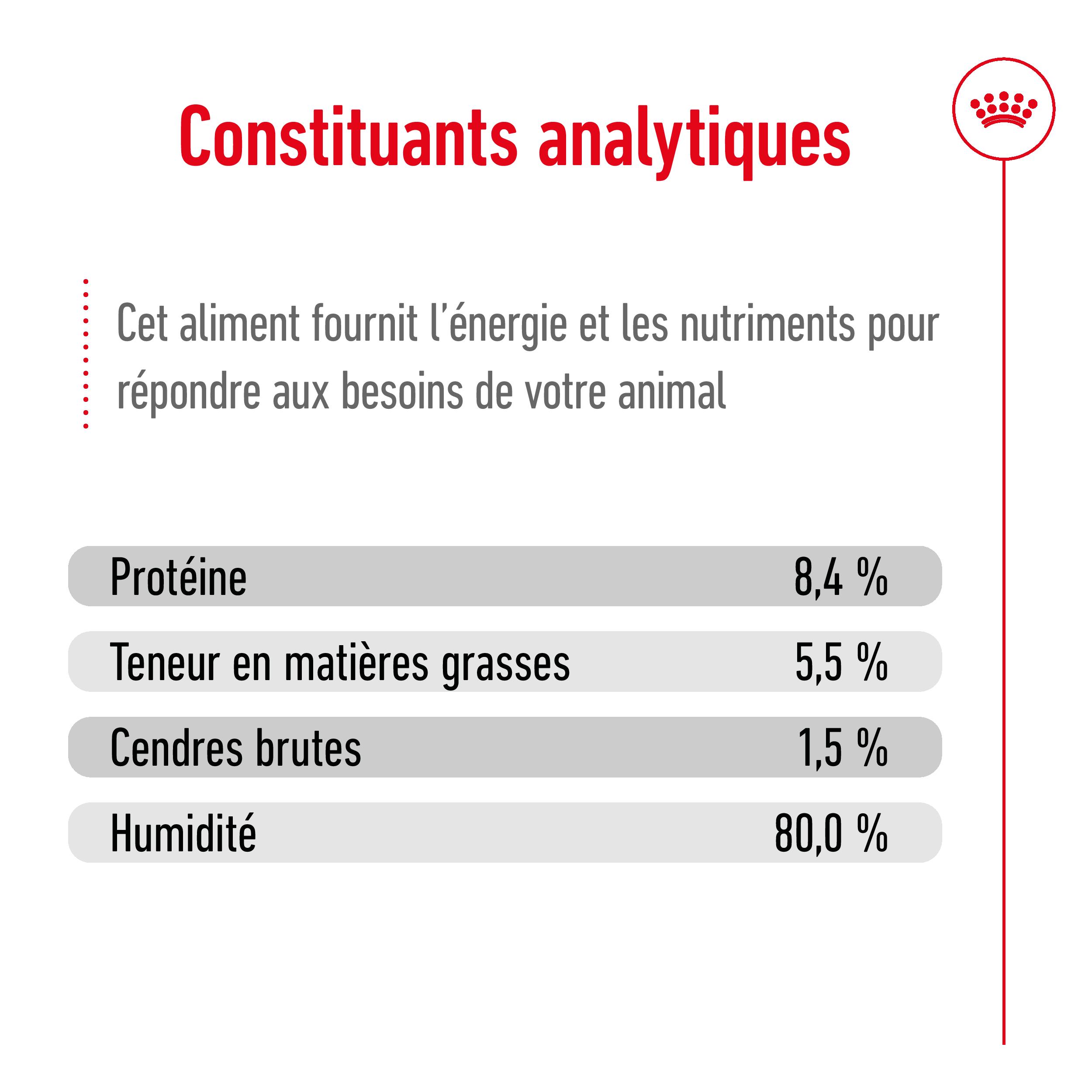 Protéine : 8,4 % – Cellulose brute : 0,6 % – Teneur en matières grasses : 5,5 % – Cendres brutes : 1,5 % – Humidité : 80,0 % – EPA/DHA : 0,12 % – Énergie métabolisable : 942 kcal/kg.