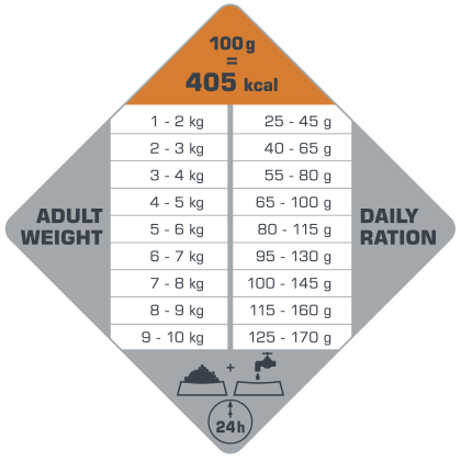 - 77 % des protéines présentes sont d’origine animale et, en combinaison avec du riz, celles-ci assurent une digestion facile et une bonne consistance des excréments. La composition extrêmement savoureuse est sans gluten et ne contient donc ni blé ni maïs. Le risque d’allergies alimentaires ou d’intolérances s’en trouve ainsi réduit.