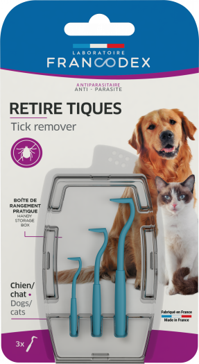 Malgré le traitement antiparasitaire, des tiques peuvent s’accrocher sur l’animal. Il est nécessaire de les extraire à l’aide du retire-tiques pour éviter la transmission de certaines maladies. Les 3 tailles de crochets Retire tiques permettent de retirer 100% des tiques avec la tête immédiatement et simplement.