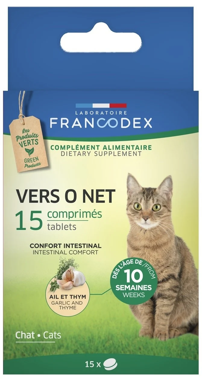 Les chats peuvent être soumis à des stress, des changements alimentaires ou des agents agresseurs entrainant des problèmes intestinaux. Les comprimés VERS O NET FRANCODEX contiennent des plantes (ail et thym), ainsi que des oligo-éléments, pour participer au confort intestinal de votre chat et renforcer ses défenses naturelles.